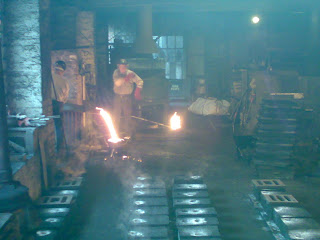 The first one shows the metal being poured into the bucket that is then used to fill the moulds. The children watching were all amazed by the 'liquid fire'. It's a good description even when you know it is molten metal. It is so alive and magical, pictures do not do it justice. Next time I will have to try and get video but I'm not convinced that will really capture it either.In the next picture you can see the long rows of moulds ready to be filled. Most of them make one item but a few do have two smaller pieces in. The ones smoking are already full. They are just sand that has been moulded into shape with a wooden base.